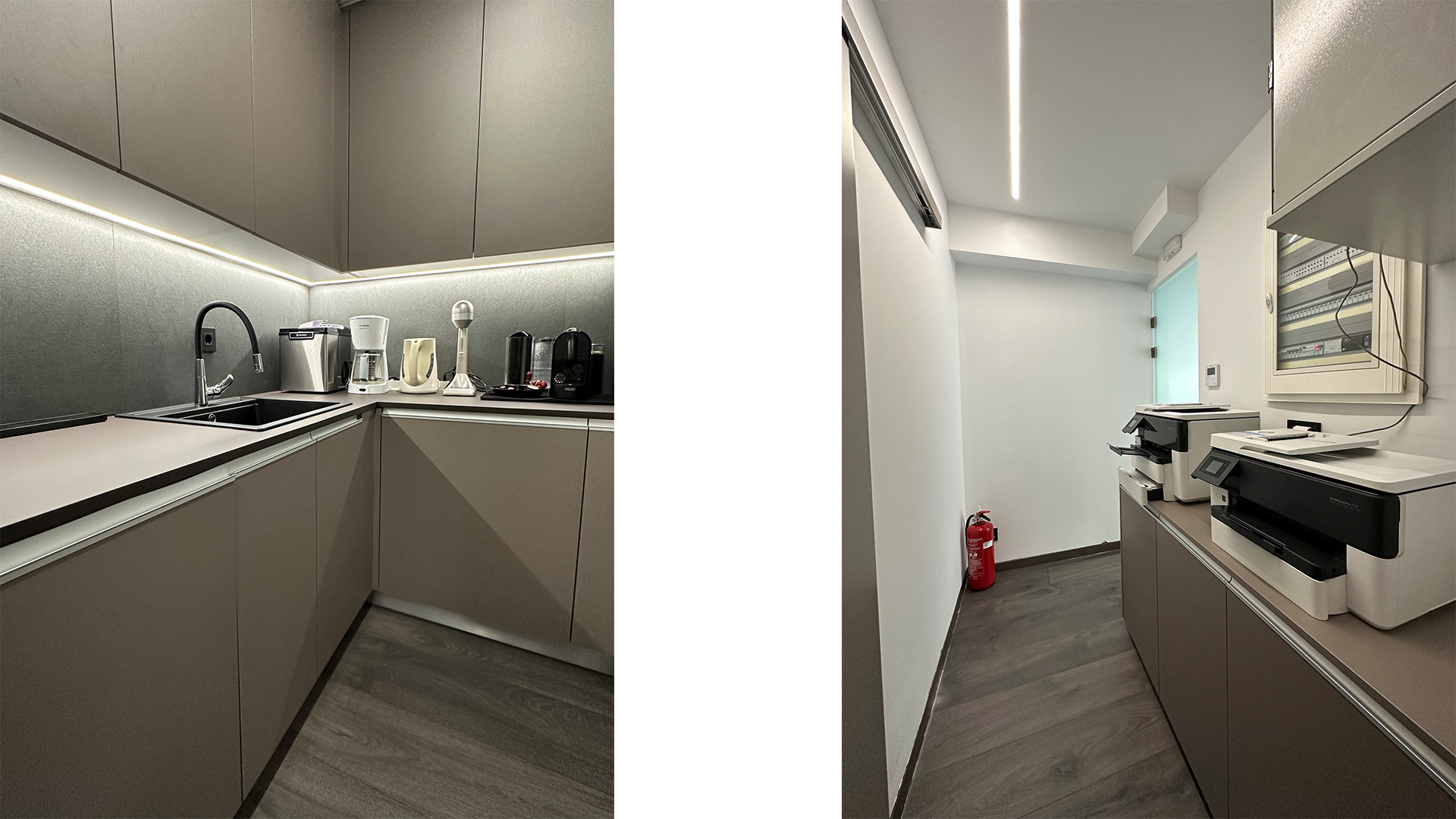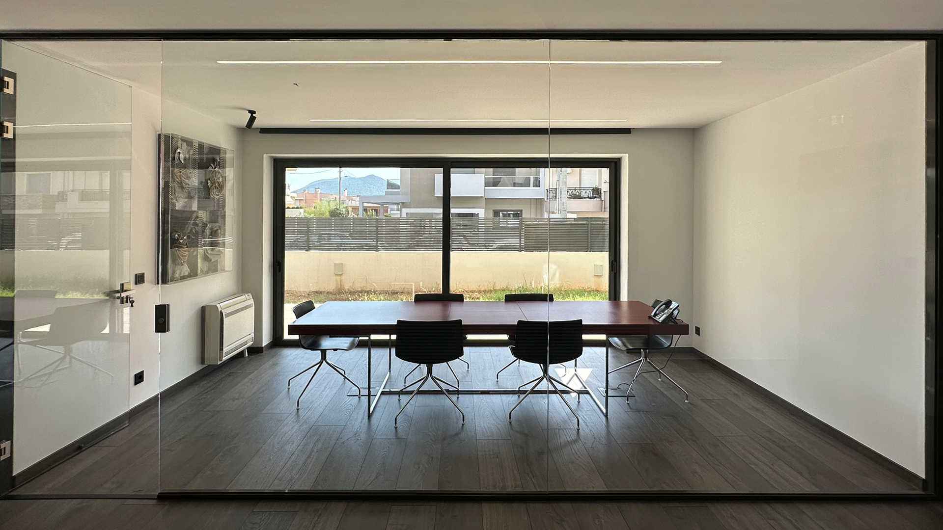 Heating is done with natural gas using an individual boiler and the REGAU company’s underfloor heating system. KNX (smart office system) has been installed to control the lights and blinds. Security cameras and the intercom are accessible locally and remotely via the internet, just like KNX.