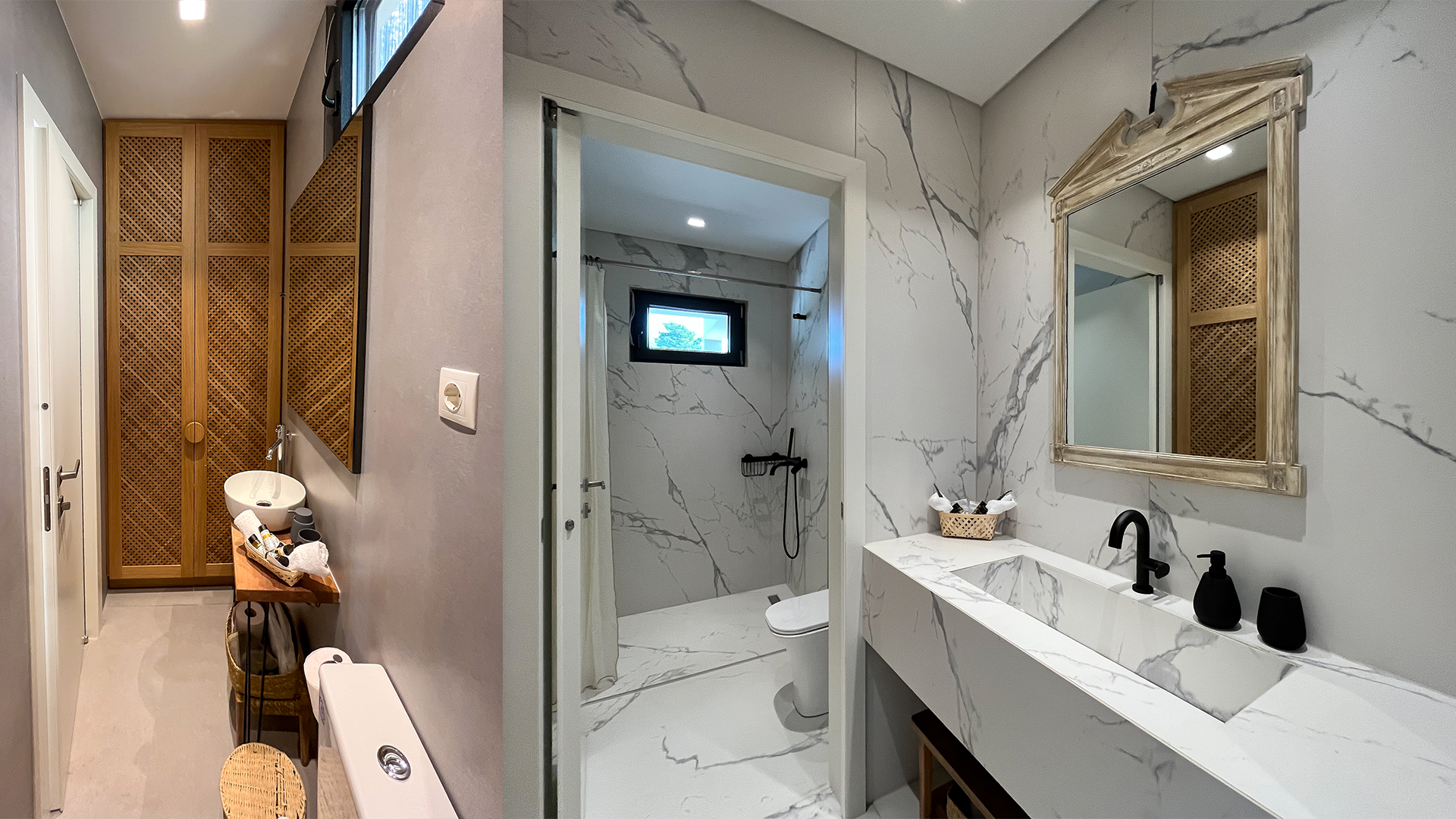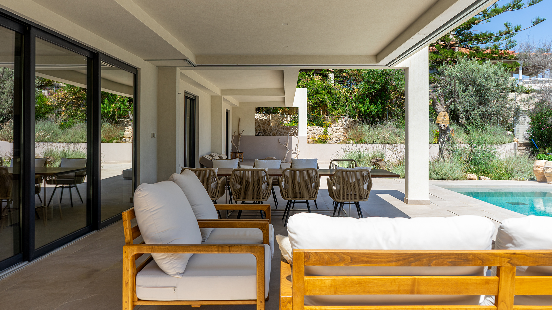 Step into a world of contemporary elegance as you enter this newly built villa. With its sleek lines and minimalist design, it effortlessly combines sophistication with the laid-back charm of coastal living. The pièce de résistance, undoubtedly, is the stunning panoramic view of the sea that stretches as far as the eye can see. Whether you’re sipping your morning coffee on the terrace or enjoying a sunset cocktail, the ever-changing hues of the sea are your constant companions.